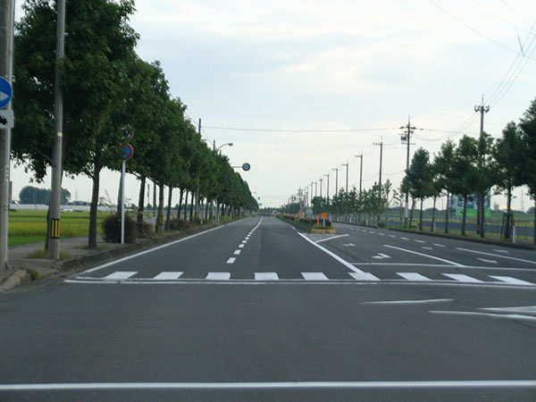 高屋橋を渡りおえて、その先を左折して北へ延びる明里橋通りは、県立武道館前を過ぎたあたりから広々まっすぐ、田園風景の中を抜けていく高速コースです。