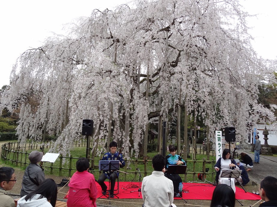 丁度、満開の枝垂れ桜の前では、二胡の演奏が行われ、あたりは桜と音楽の共演に包まれました。